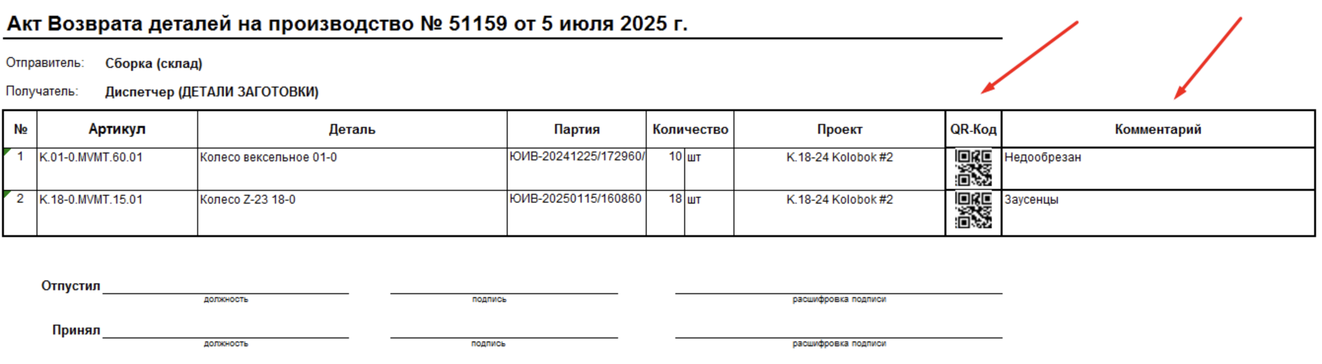Описание: Добавление колонки с QR-кодом партии и комментарием в печатную форму Акта возврата со сборочного участка.