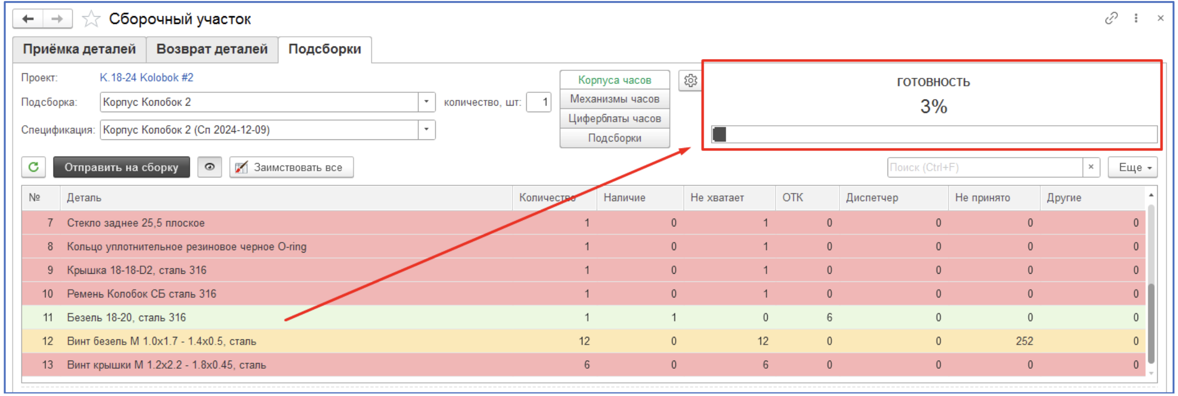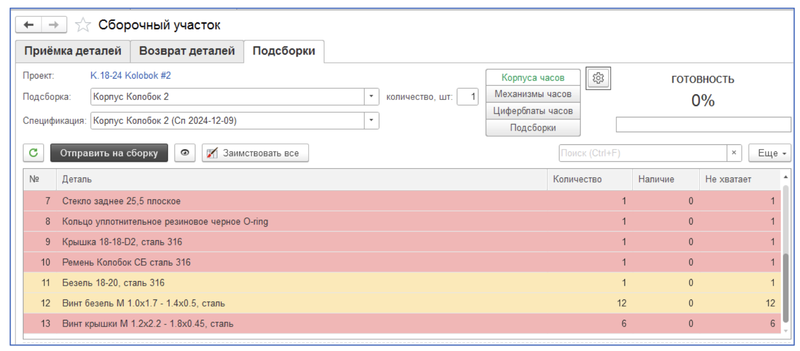 Описание: Оптимизация учёта на складе "Сборка (Детали)", внедрение возможности подбора деталей и выпуска основных частей часов.
