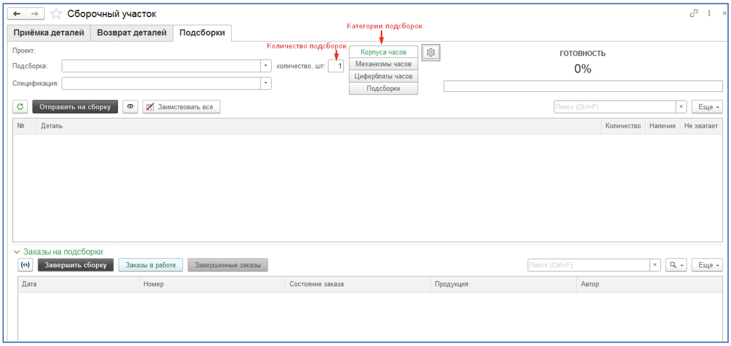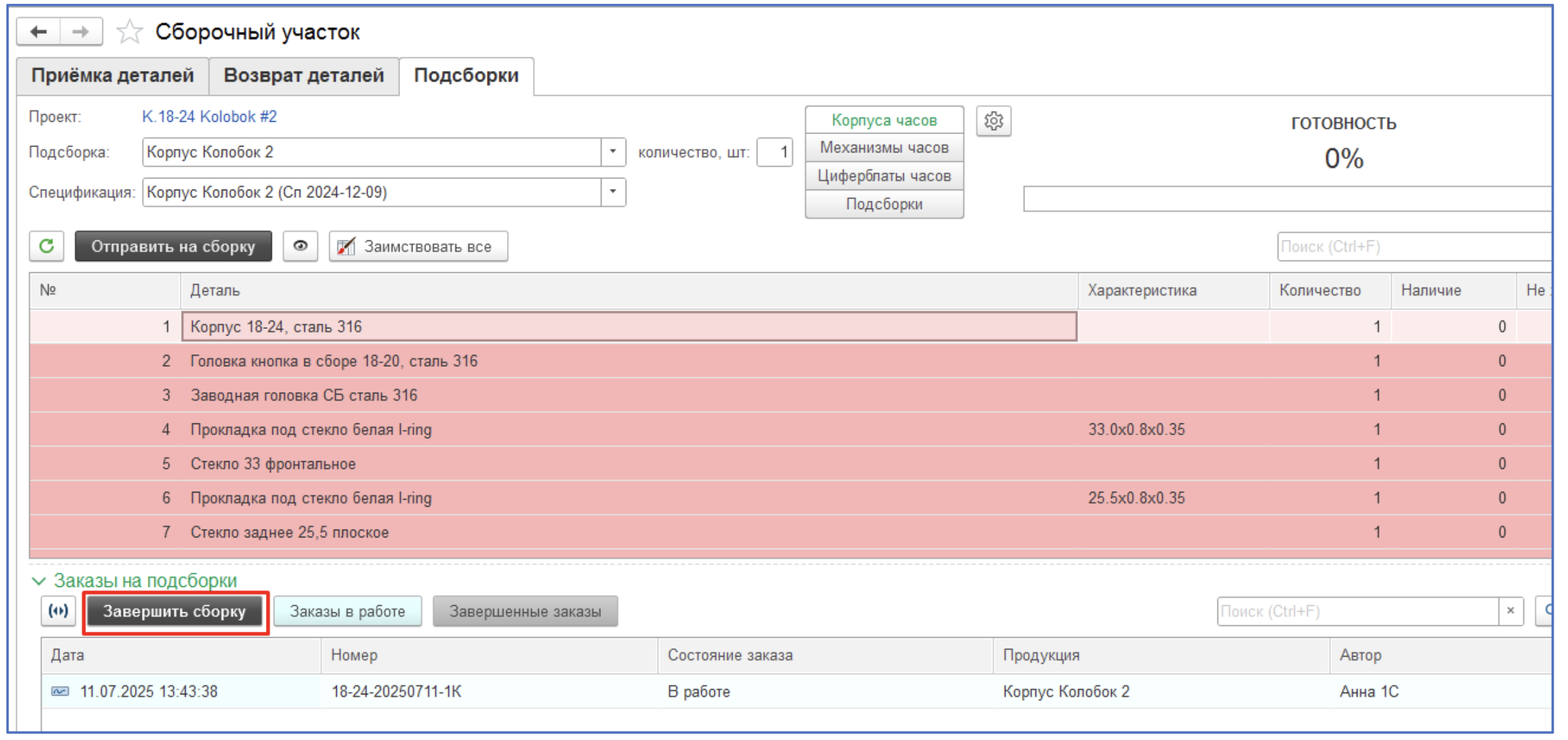 Сборка (ДЕТАЛИ) – основной склад, на котором собираются подсборки и часы.