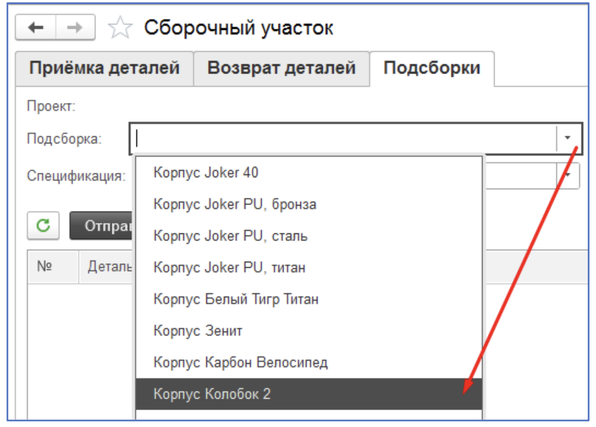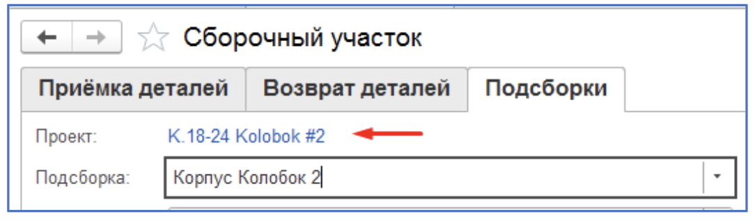 4. После выбора подсборки автоматически заполнится реквизит проект