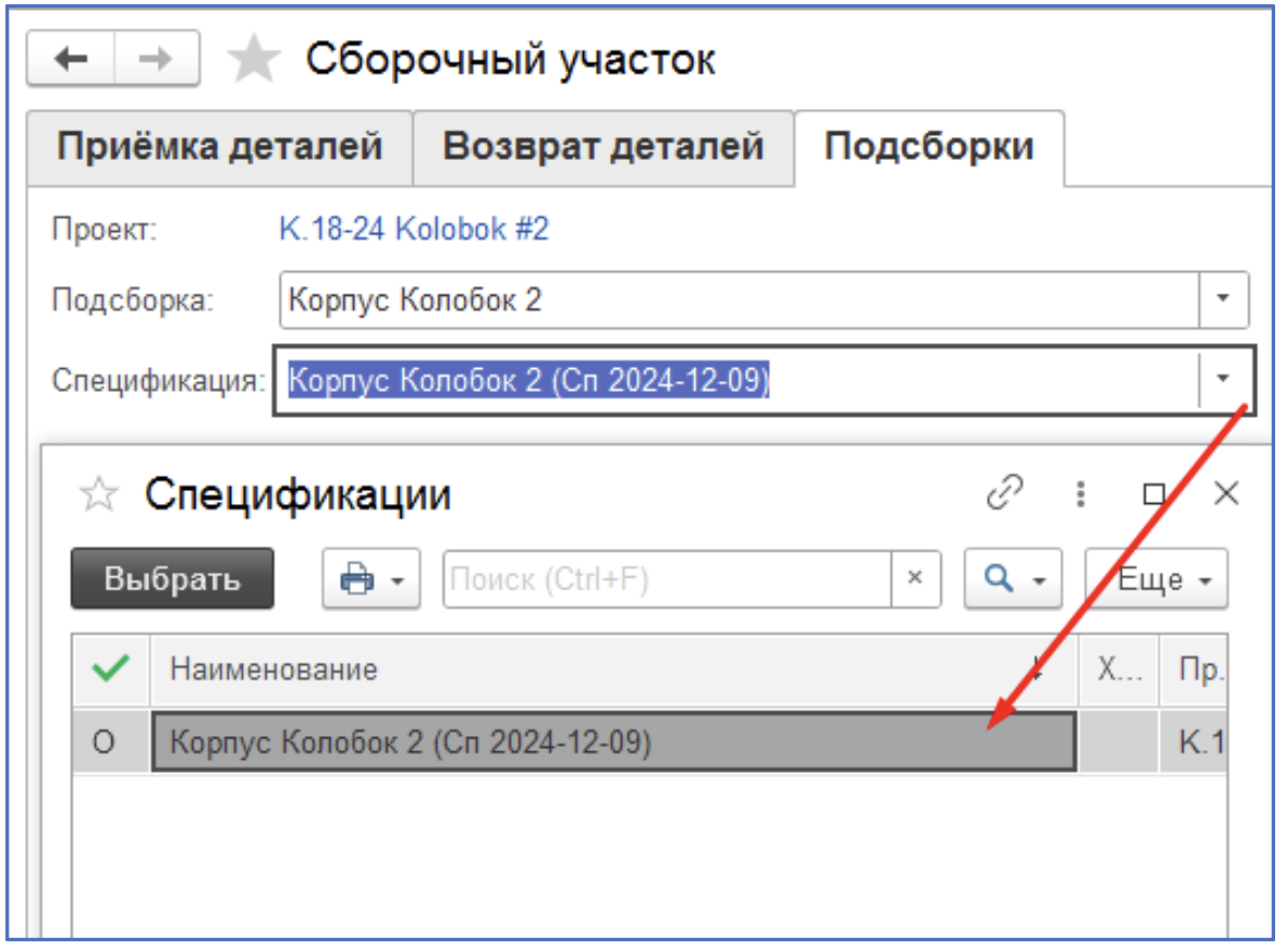 5. Выбрать спецификацию подсборки. Автоматически подставляется основная спецификация.