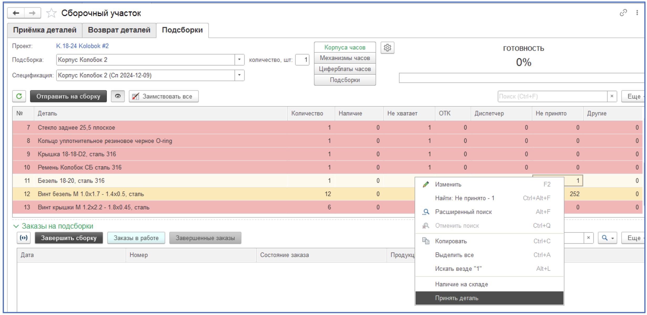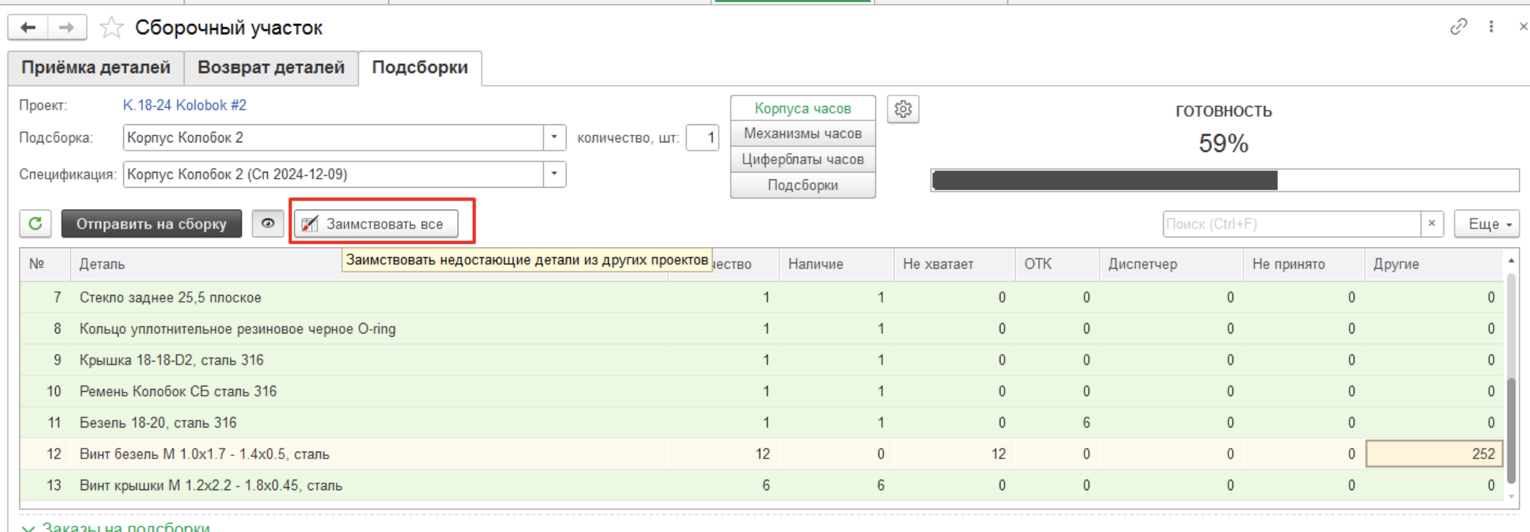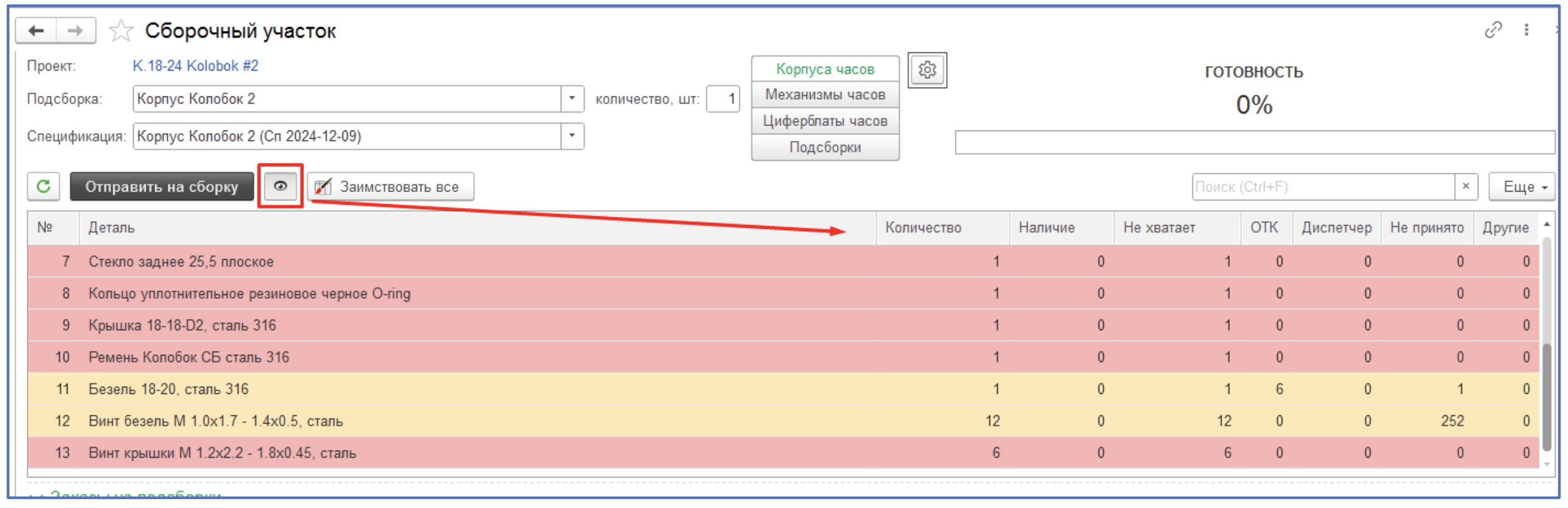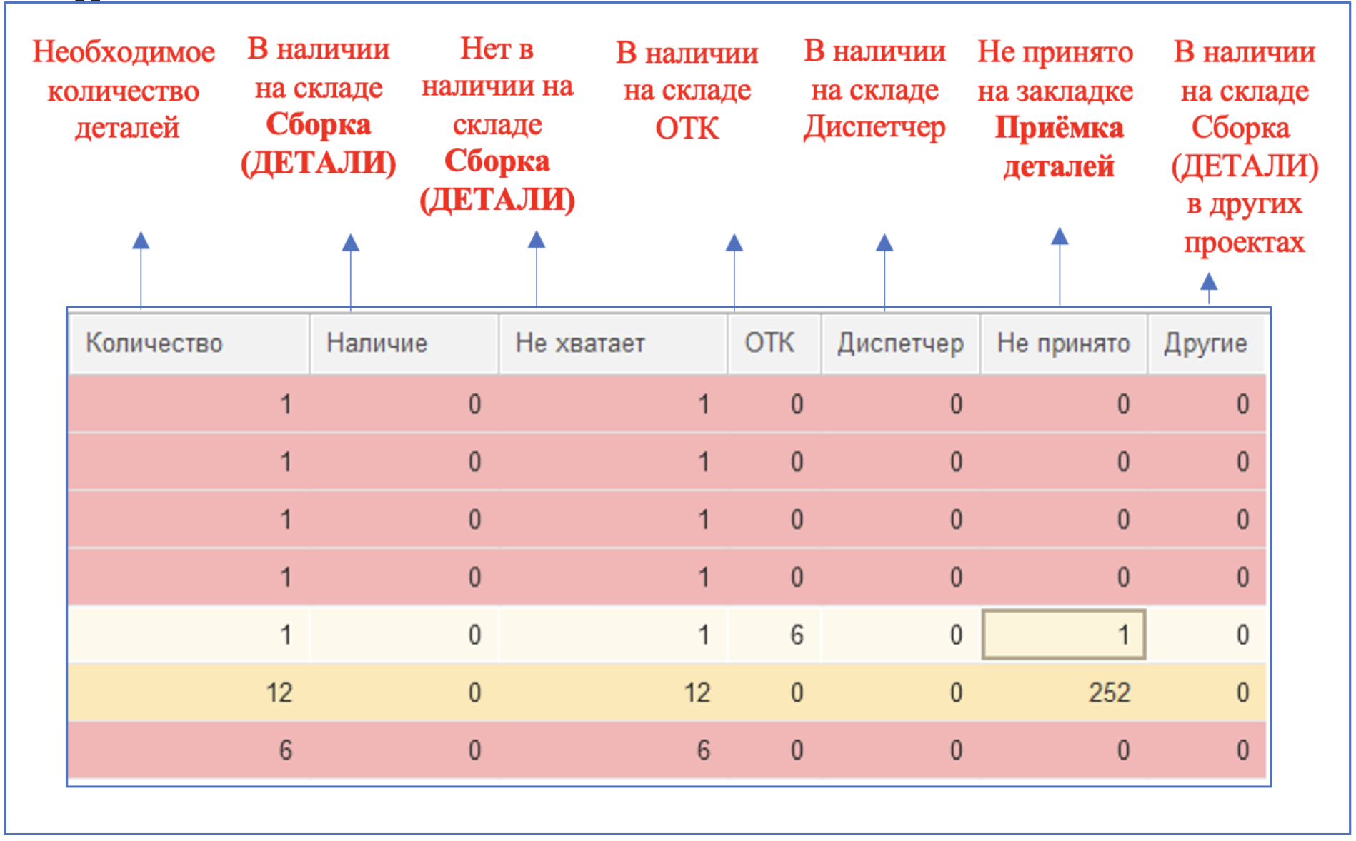Желтая подсветка – нет на складе «Сборка (ДЕТАЛИ)» в ячейке проекта, но имеется остаток на других складах, либо деталь не принята (ждет приемки на сборочном).