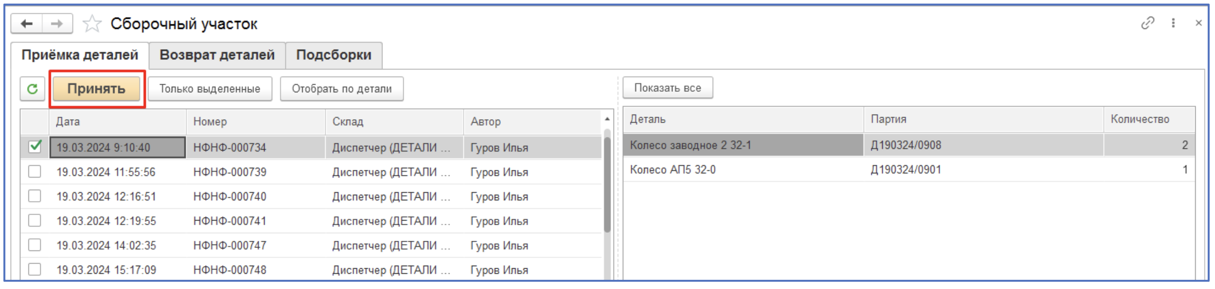При выполнении команды автоматически открывает первая закладка «Приёмка деталей»и срабатывает фильтр по выбранной ранее детали
