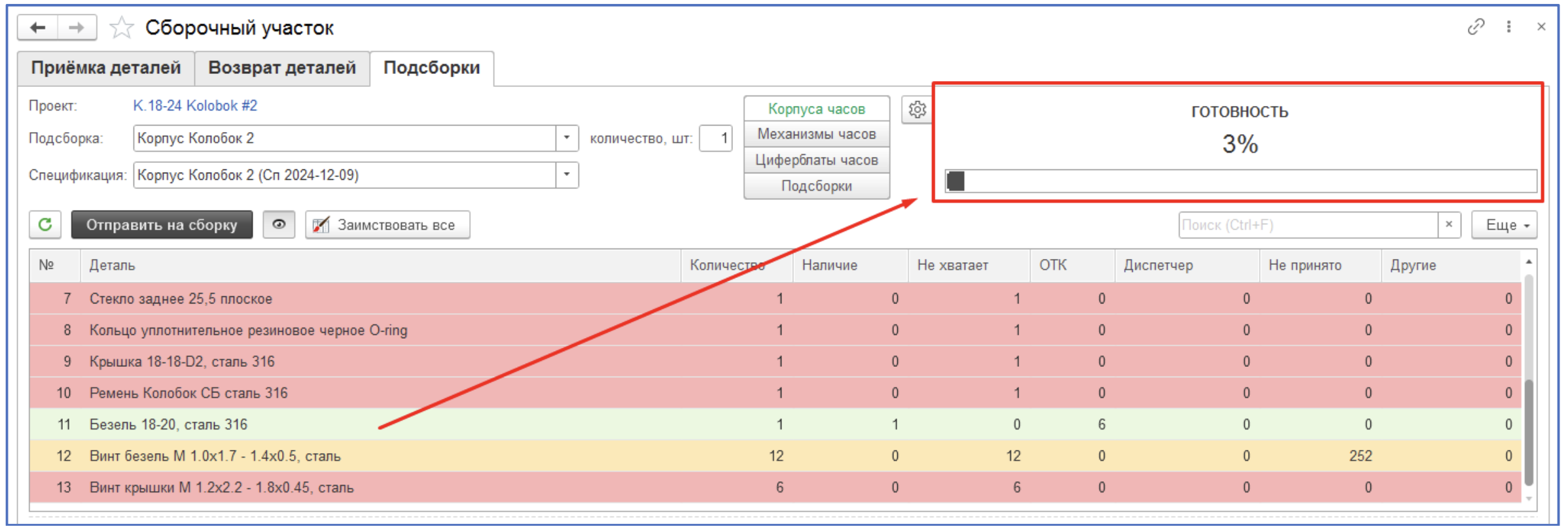 10. В верхней области расположен расчет процента готовности деталей для подсборки, а также визуальный прогресс-бар.