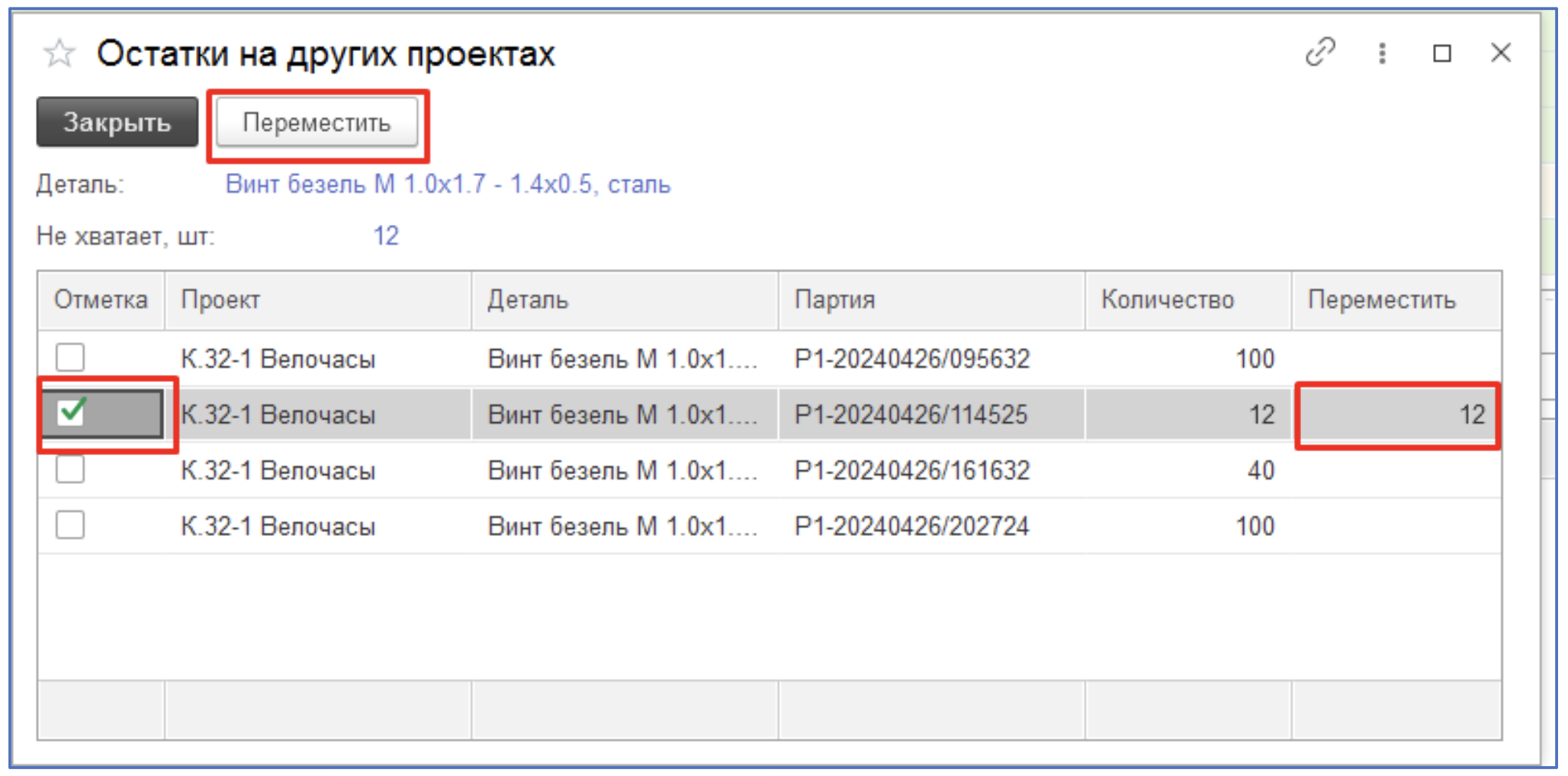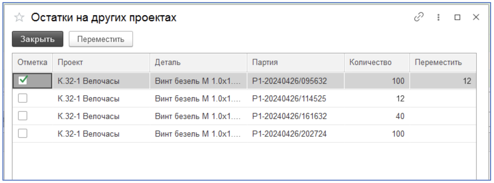Автоматически подставляется первая из списка партия с остатком (можно заменить на другую при желании).