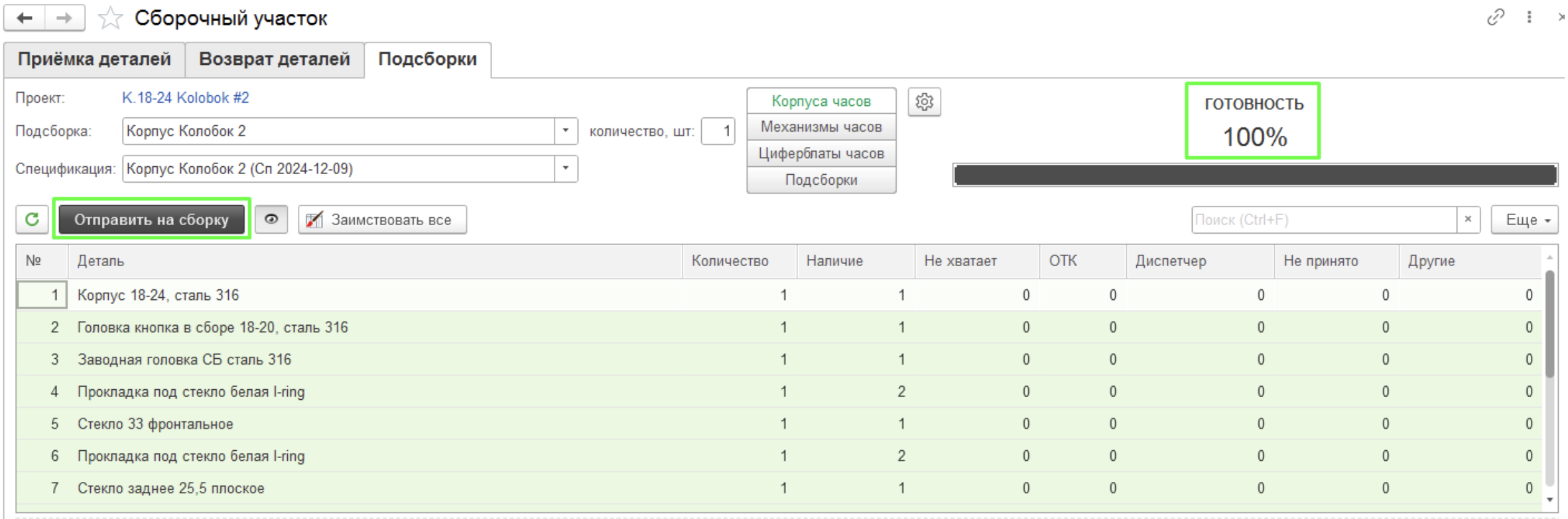 12. Когда все необходимые детали находятся в нужной ячейке (все строки с зеленой подсветкой), прогресс-бар показывает готовность 100%, нажимаем кнопку «Отправить