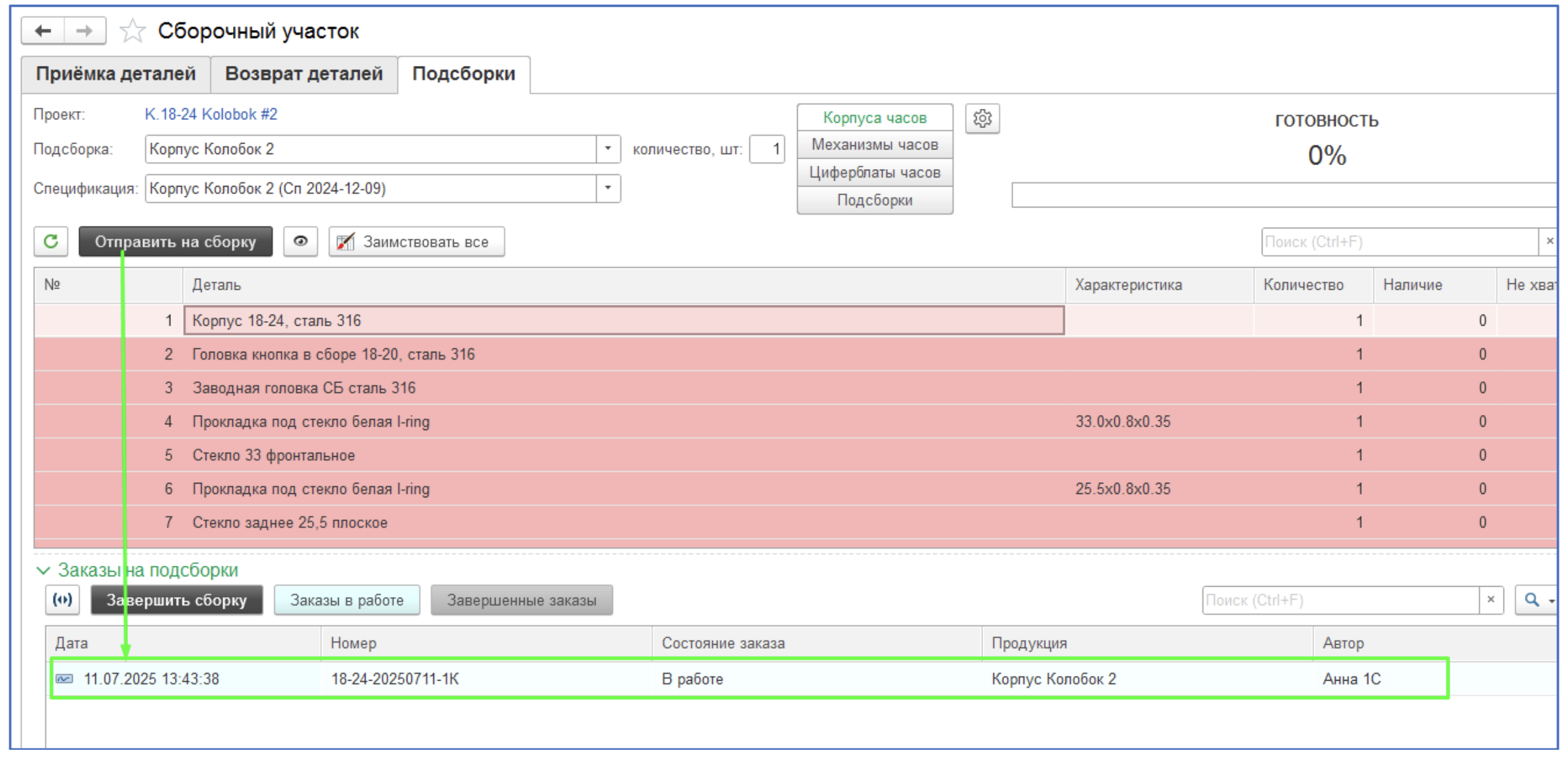 13. Нажимаем кнопку «Отправить на сборку». Создается заказ на производство подсборки. Заказ автоматически берется в работу. При этом со склада сборки списываются комплектующие в необходимом количестве. Если было указано более 1 подсборки, то создается несколько заказов.